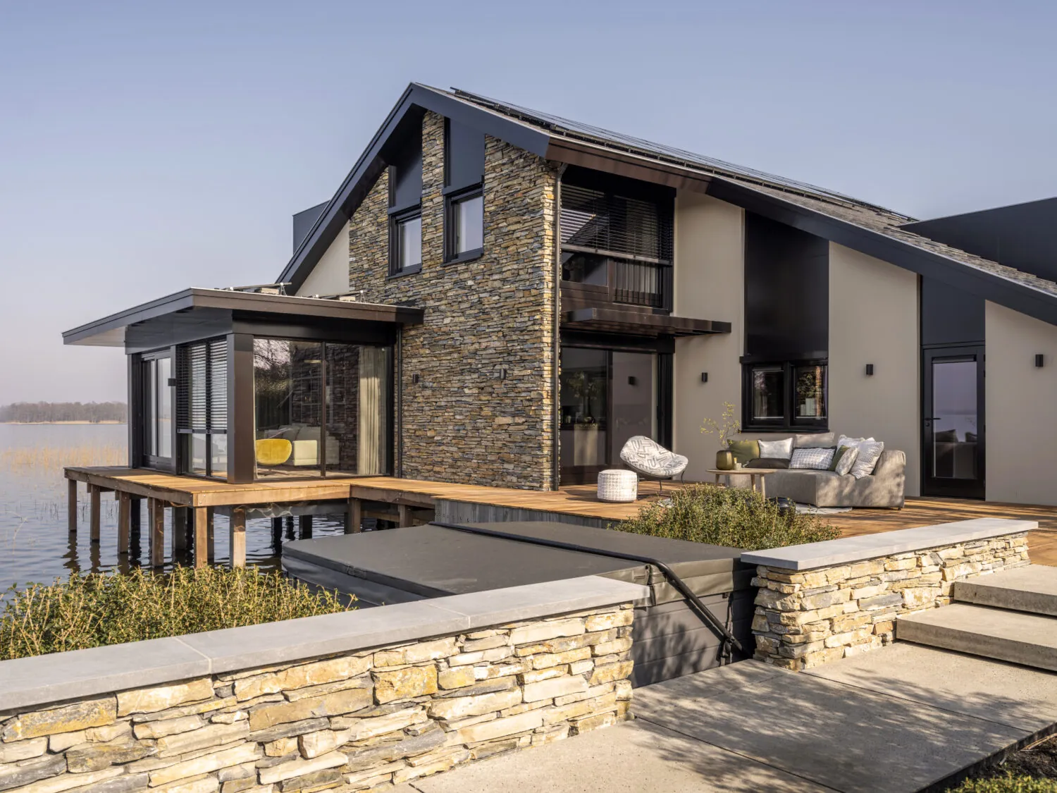 De tuin en de waterfaciliteiten rondom het huis zijn met dezelfde aandacht ontworpen als het interieur: diverse terrassen, een aanlegsteiger en een boothuis nodigen uit tot het buitenleven en versterken de verbinding met de plas. Hier wordt wonen een continu samenspel tussen natuur, licht en architectuur, een plek waar elke dag voelt als een ontsnapping aan de drukte van het alledaagse.